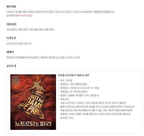 뮤지컬 노트르담 드 파리 예매 티켓을 최대 67%까지 할인하고 있다는 정보입니다!