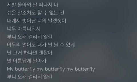 다시 돌아와달라고 말 못하겠는 건 니가 나보다 딴 남자 곁에 있을 때 더 행복해보여서라잖아.....행복해하는 그런 너를 볼 수만 있다면 된다잖아......그걸 나비에 저렇게 비유했잖아........