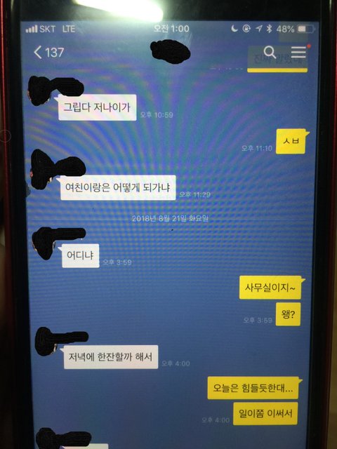 남자친구는 사업을 하는데 사무실에서 혼자 잠이 잘듬. 어김없이 혼자 잠든 어느 날 난 혼자 컴터를 하는데 어떤 여자이름으로 카톡이 옴.