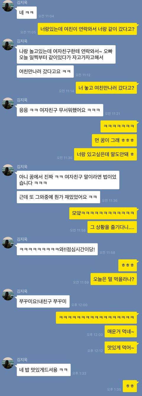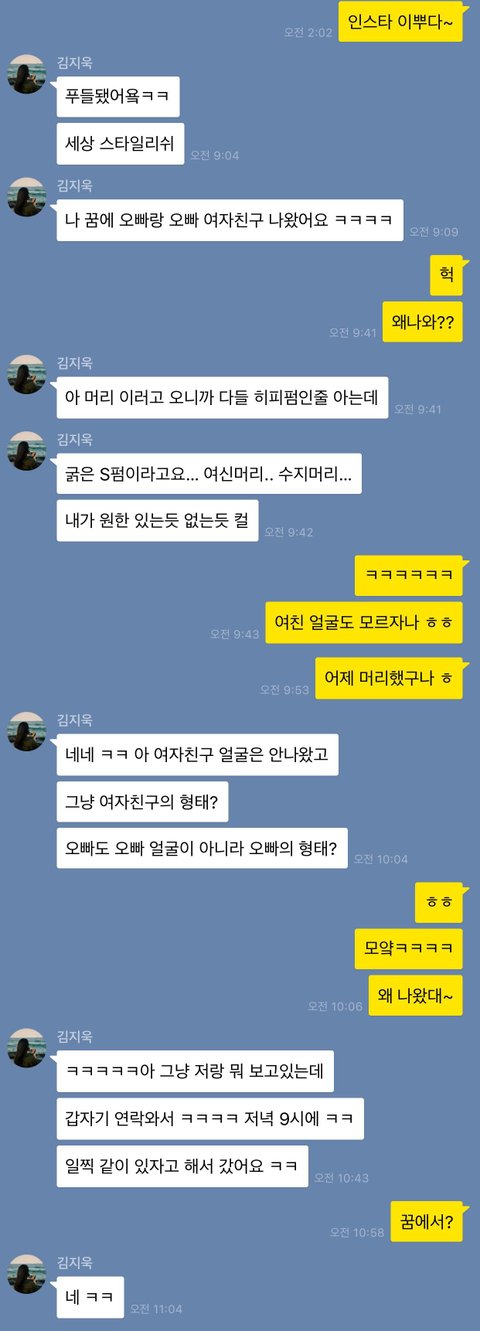 대화에서보면 무슨 개같은 꿈꿨다고 뻥치면서 남자친구 슬슬 건드려서 내가 남자친구 꽉잡고 있느네 마네 하면서 자존심 센 남자친구 자극하고, 닭살돋는말 별로 못하는 인간한테 "너랑있고싶은데"같은 말을 뽑아냄.