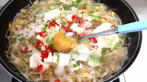 그 다음 콩나물을 넣고 5분간 끓은 후, 아까 썰어놓은 두부와 다진 야채를 넣어 주어요~