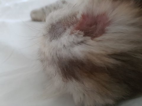 이 사진은 귀에 옮겨간 링웜이 거의 다 나아갈때쯤이네요... 링웜이 시작되면 털이 뭉텅뭉텅 빠지고 딱지가 생깁니다.