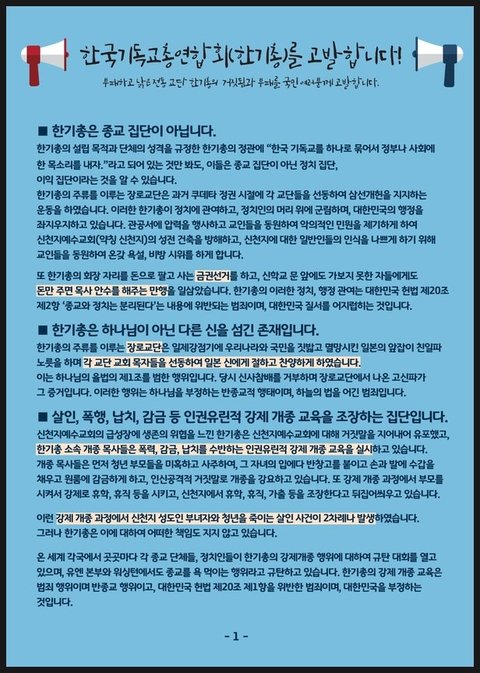 종교의 자유를 억압하고 종교를 세상에 욕되게 하는 한기총의 폐쇄를