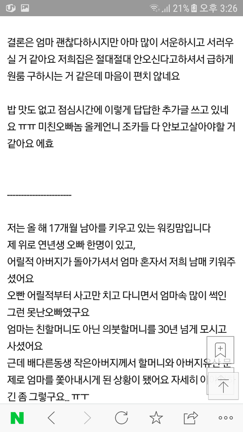 근데 배다른동생 작은아버지께서 할머니와 아버지유산 문제로 엄마를 쫓아내시게 된 상황이 됐어요 자세히 이야기하긴 좀 그렇구요... ㅠㅜ