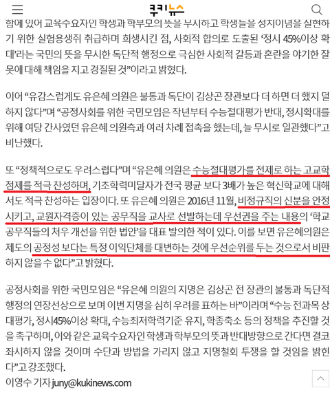 수시 또한 없앨 수 없는 부분을 인정합니다. 도시와 시골 간의 교육 격차를 해소하기 위해서는 수시의 일정량 확보는 중요합니다. 하지만, 수시의 비중이 70% 이상이 넘는 시점에 있어서 여러 문제점이 대두되고 있음에도 (학종의 비중이 큰)수시 확대와 수능 절대 평가의 도입은 학생들에게도 노력에 대한 정당성을 가르쳐주지 못 합니다.