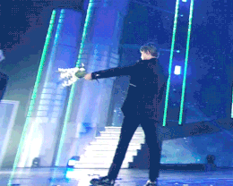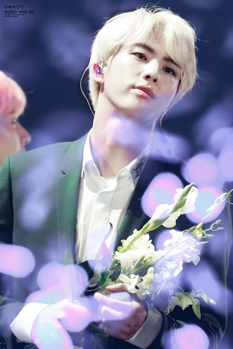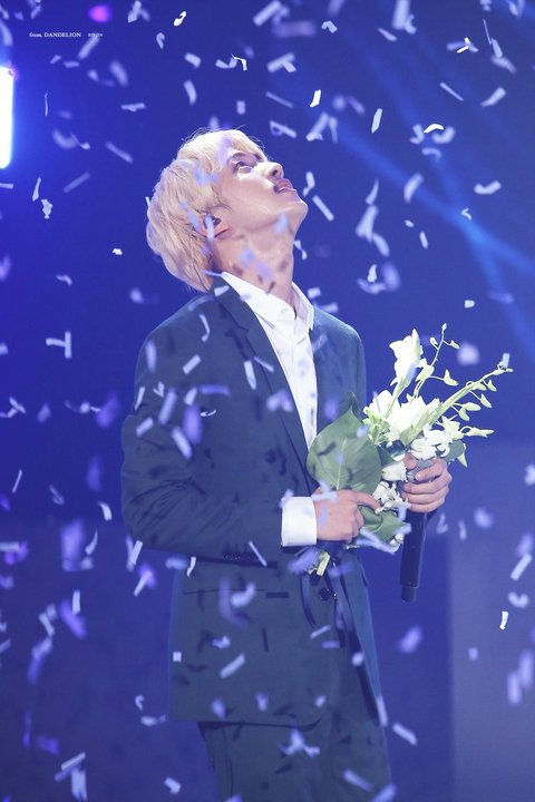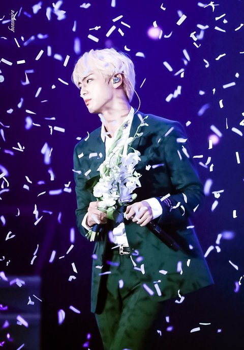 진이 꽃다발을 위로 치켜 든 순간 무대 위 조명이 켜지면서