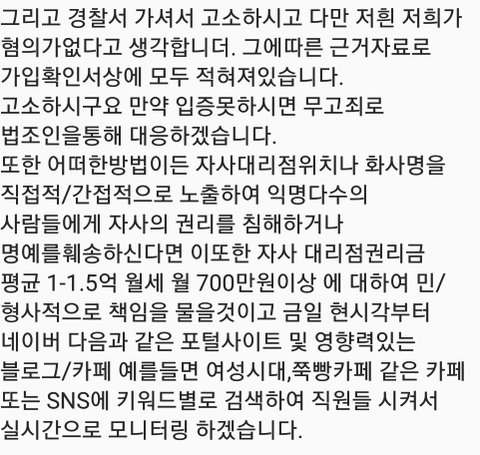 아니 본인들이 정당한 거래를 했다면 뭐가 두려워서 명예훼손한다하는 걸까요? 저는 이글에서 비방의 글은 쓴적없고 제가 핸드폰을 지극히 후하게 구매하고 경험과 느낀점을 쓴 후기이며, 모두가 피해보지 않기위해, 공공의 이익을 위해, 다시는 저같은 호갱고객이 양산되지 않도록 하기위해 공유하는 것임을 명시합니다. 대리점 명칭이나 위치를 올리지 말라셔서 [특징:젊은이들의 핫플레이스 서울 길가에서 요금제 스티커붙이게 하는 공식대리점,이전대리점이 사기꾼들이라고 주장함,본인들은 절대 사기 안친다고 주장 주의]은 되도록 피하시길 바랍니다.(직원철면피주의,고객의 피같은 돈 200만원먹고 고객 고소한다고 하는 사람들임) 또한 통신사에서 책임지는 범위는 극히 제한되오니 통신사도 믿지 마시구요 저처럼 바보같은 짓하지 마시구 다들 현명하게 계약서 꼼꼼히 읽어보시고 거래하시기 바랍니다. (또한 제글을 읽으시고 멍청한 니가 당해도 싸다하시는 분 있을텐데 의외로 공식대리점이라는 말만믿고 맘놓고 계약서 제대로 안읽고 거래하는 분들 많아 도움되길 바라는 맘에 끄적이는 것이니 저에대한 비판은 맘속에 간직해주시면 감사하겠습니다)