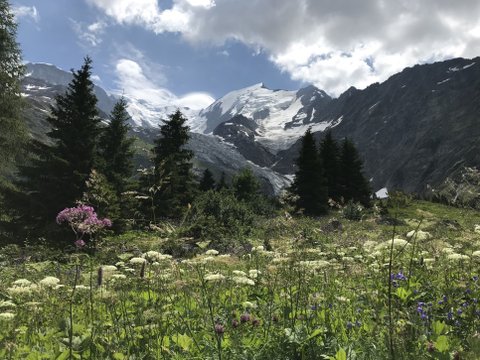 첫날 트레킹 시작한지 얼마 지나지 않아 보게 되는 첫 알프스의 모습! 알프스의 만년설과 한여름의 야생화가 만나 잊지 못할 뷰를 감상할수있습니당