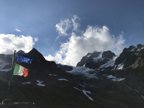 이탈리아 국경을 알리는 산장에 걸린 이탈리아 국기와...