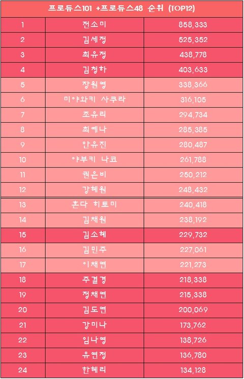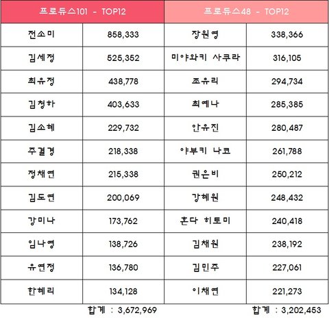 프듀101 최상위권 애들은 코어가 엄청 쎄고 프듀48 애들은 넘사벽 코어가 없고 전부 다 득표수가 비슷비슷함 그래서 이번 프듀48이 역대급으로 순위 변동이 심했던거 같음..