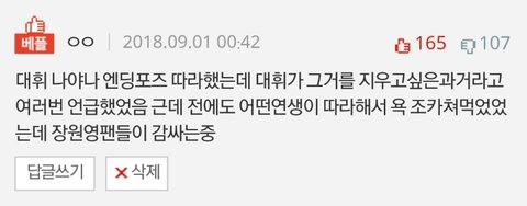 베댓된것도 몰랐고 대댓 상태가 가관이길래 우선 댓삭은 했음 근데 이게 왜 팬코라는거야 ? 이 글 처음 올라왔을때 다 무슨일이냐는 댓글 쓰길래 상황설명 한건데 왜 내가 팬코소리를 들어야하지ㅋㅋㅋ 뭐만하면 팬코팬코 슬슬 기분나쁨 이제