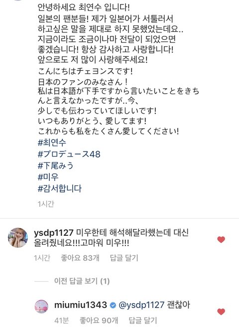 미우가 본인 인스타에 최연수가 일본어 잘 못하니깐 해석해서 올려주고 그와중에 괜찮다는 ㅋㅋㅋ
