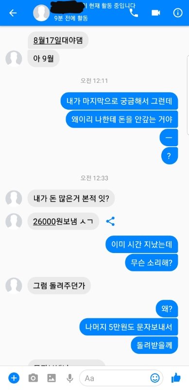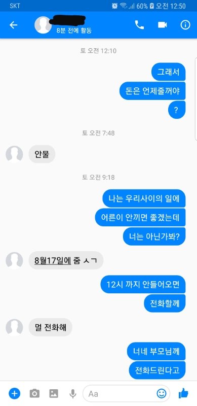 8월 31일이 되어도 S는 돈을 갚지 않았고 12시까지 돈을 안보내면 S의 부모님께 연락드리겠다고 했어