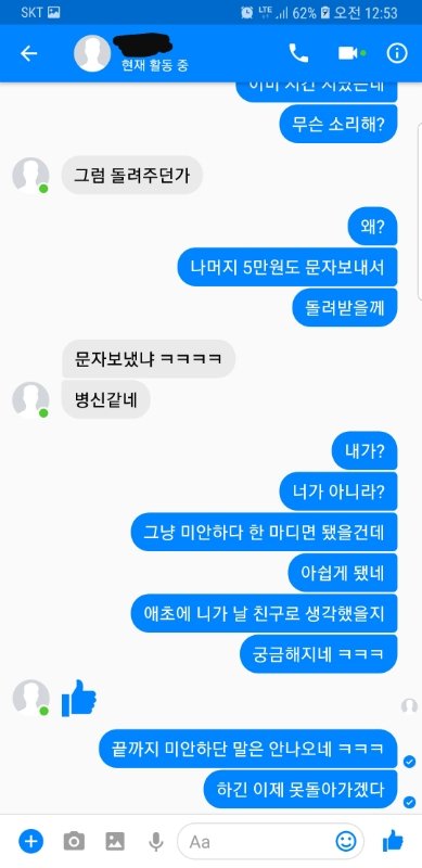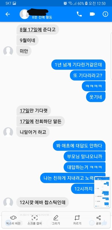 6. 내가 돈 언제줄꺼냐고 물음 > S의 대답: "안물", "안궁"