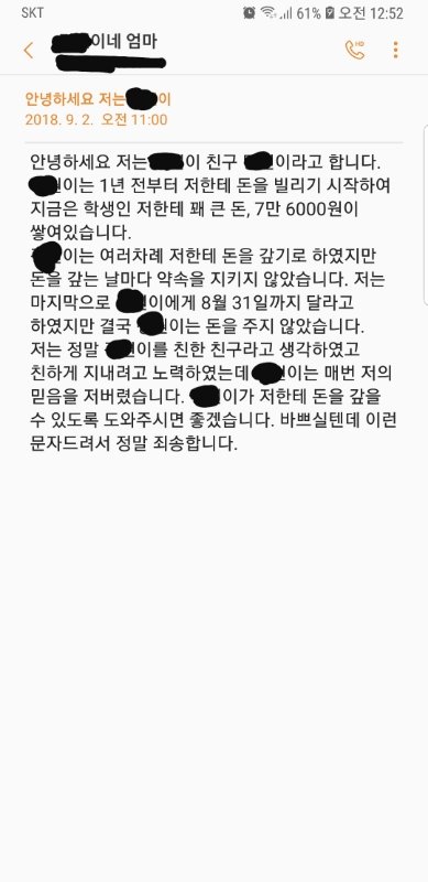 내겐 중학교 다닐 때 가장친한 친구라고 생각 했던 얘가 있어 비록 3학년 때 좀 어색했던 적이있지만 정말로 친하다고 생각해서 나는 1년 전부터 걔가 돈을 빌려달라고 할 때마다 돈을 빌려줬고 결국 지금은 나한테 꽤 큰 돈인 7만 6000원이 되었어.