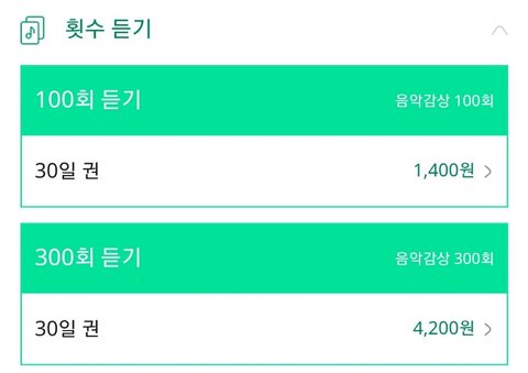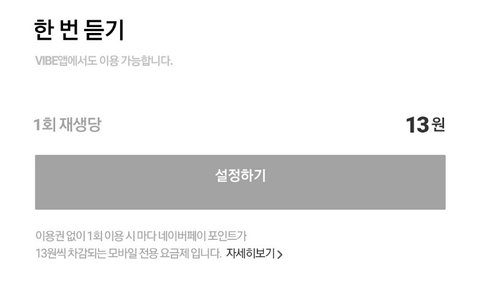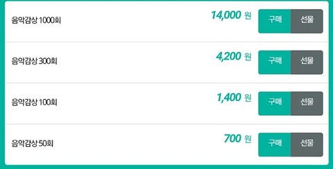 멜론,엠넷,지니에 횟수 듣기 이용권도 있습니다! 무제한 스트리밍권보다 가격도 저렴하니까 부담되시면 횟수 듣기로 구매 부탁드립니다! 그리고 네이버뮤직은 네이버페이 포인트 13원으로 한 번 스트리밍 가능하니까 많이 이용해주세요!