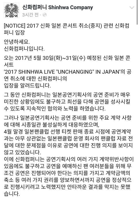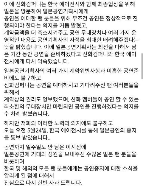 작년 5월달에 일본 도쿄에서 신화콘서트가 예정되어있었습니다. 그리고 콘서트 3주전에 티켓 발송이 시작된다고 하였으나, 10일전이 되어도 티켓은 오지 않았고, 다들 설마 이러다 취소가 되진 않겠지?? 하고 걱정을 하였는데.. 설마가 사람잡는다고 콘서트 일주일 전에 콘서트는 취소가 되어버렸습니다.