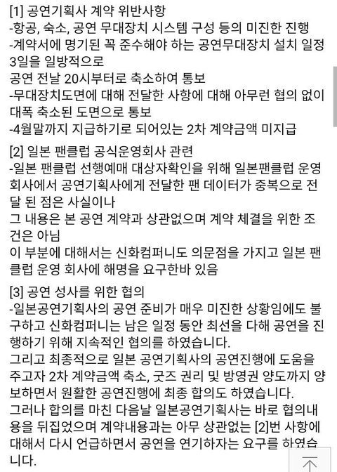 그런데, 며칠후 대행사측에서 글이 올라왔는데, 공연준비에는 문제가 없었다며 글과 사진이 올라왔습니다. 심지어 신화컴퍼니측에서 계약내용에 거짓말이 있었으며, 팬클럽 인원수를 속였다고도 하고요. 이 글과 함께 다들 혼란이 시작되었습니다만 이건 진짜 조족지혈이었습니다.
