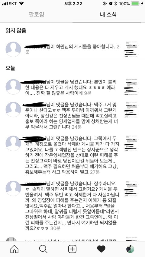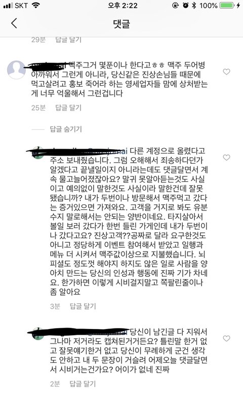 (추가) 그리고 이런 이벤트 하면서 지우는 사람도 한둘이 아닐텐데 이런걸 감수하고 했어야 하는거 아닌가요?;; 싫으면 이벤트를 그만하던가 아님 이런 고충을 자기들 계정에 공지로 쓰던가 할 일이지, 사진 지운 피드에 와서 다른 사진에다가 맥주먹고 지웠다고 하는건 망신주기밖에 더하는거 아닌가 싶거든요. 한번 가보고 사진을 두번 올렸으면 홍보를 했으면 했지, 먹튀 아니라고 다른 계정에 사진올린거까지 보여줬는데도 그럼 오해해서 죄송하다 혹은 알겠다고 하면 끝날 일인데 처음부터 다른계정에 올렸으면 오해는 없지 않냐는 둥 어제와서 또 공짜맥주 먹엇다면서 다른날 온거라는 둥 하지도 않은 일을 덮어씌워서 우기는것도 시비라고밖에는 생각이 안되고요. 그리고 인스타 사진만으로 본인이 생각하는 그 사람이 맞는지, 다른 계정에 올린 게 같은 사람인지, 몇번 왔는지는 어떻게 확신하죠?? 그게 더 소름이예요. 여러사람이 각각 올릴수도 잇는거고 태그가 천개가 넘는데 이걸로 트집잡는게 너무 어처구니가 없고 화가나요!