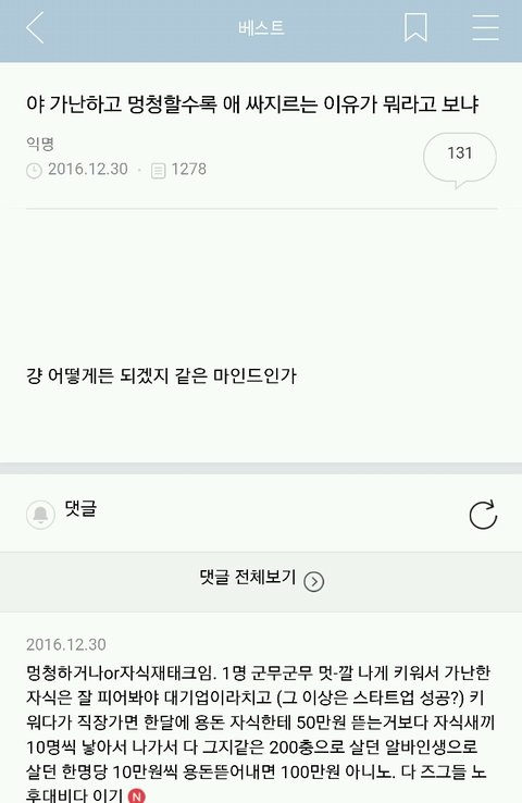 가난보다는 멍청한게 문제임...이게 멍청하다는게 공부 못하고 그런거 아님 그런거 보다는 사람이 살면서 꼭 배워야할것들 있잖아..뭐 기본적 매너라던가 어딜가면 어떻게 행동해야 한다던가 그런것들..그런것조차 제대로 습득못한 그런 사람들이 애 많이 낳음. 디씨 흙수저 갤러리만 가봐도 가난하고 애까지 많은 부모들이 가장 많이 하는 말이 뭔지 앎? "내가 널 낳아서 이만큼 밥 멕이고 학교 보내줬으면 너도 나한테 그만큼 해줘야지!" 이거임 정자 난자 만난 순간부터 뱃속에서 떠내려가도록 "나 좀 낳아줘!!!!" 라고 소리친것도 아니고 강아지 한번 데려오면 죽을때까지 사랑으로 책임지듯이 자식도 지들이 지들 맘대로 싸지르고 낳았으면 의식주는 "기본" 으로 책임져야 한다는 사실을 모름. 그냥 그건 당연한건데 저런 사람들 기준에선 그게 절대 당연한게 아님. 학교 다니는것도 (대학은 제외) 저 사람들 기준에선 당연한게 아니라 엄청 큰일 해준거임. 흙수저 자식들이 가장 환멸나는 포인트도 바로 이거임. 그들 입장에선 돈많고 그런 부모 좋겠지만 꼭 그런걸 바라는것도 아님. 내가 올바르게 성장하고 똑부러지게 세상 살아갈수 있는 멘토이자 성숙한 리더같은 부모를 바라는건데 허구한날 집에서 하는 소리가 내가 의식주 해결해줬는데 뭘 더 바라냐 이거임. 그래서 나는 개인적으로 부모가 되려면 돈보다는 일단 머리 사상부터 테스트하고 그러고 나서 자식 낳아야 한다고 봄.