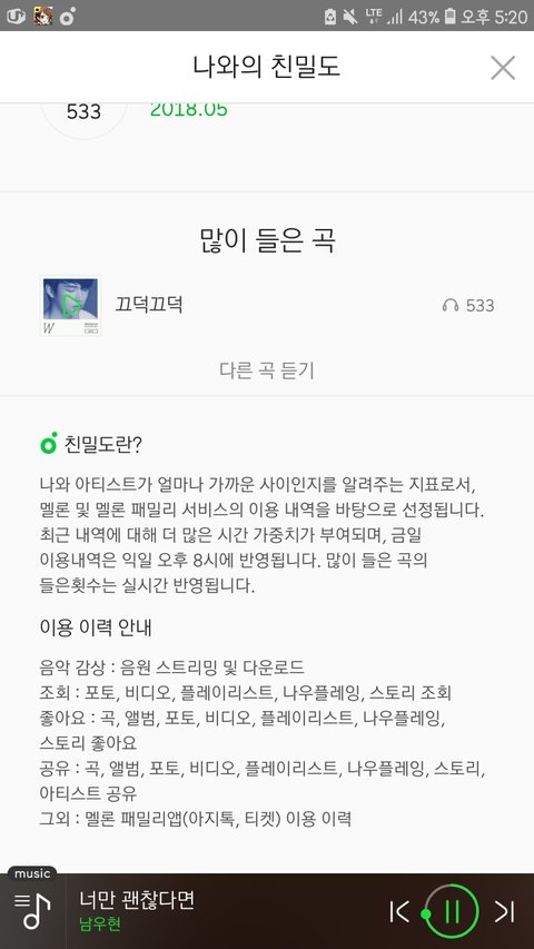 지금 내 친밀도? 이건데 나 어제 음원 나오자마자 들었거든 왜 횟수가 안 뜰까...?