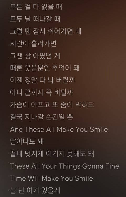 아까 여기 올라와서 들어봤는데 진짜 내 인생위로곡 될것같아 요즘 학업스트레스에 막 여러가지로 너무 힘들었는데 이 노래 가사보고 울었잖아,, 다 위로해주는 느낌이랄까? 진짜 다들 지치고 힘들면 이 노래 한번 들어봐 정말 위로 많이되고 다시 힘낼 수 있을 것 같아 남우현 이번 노래에 smile 이라는 노랜데 타이틀도 좋긴한데 스마일 앞으로 힘들때 마다 들을려고!! 밑에 가사 올려놨으니깐 다들 한번 들어봐 진짜 울컥해