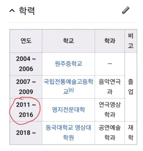 그런데 위키백과는 2016년까지 전문대 재학이라고 되어있어