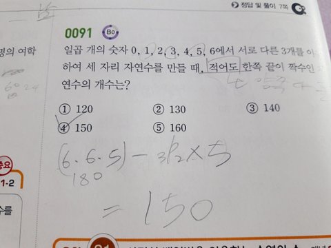 적어도 라는 말이 나오니까 전체 경우의 수에서 반대 경우 (양끝 다 홀수일 경우)를 빼면 되자나 그래서 전체 저렇게 구했고 양끝에 홀수를 두기 위해서 3P2 한거까지 이해 되는데 뒤에 왜 곱하기5를 해야하는지 이해가 안 돼... 홀수 세개중에 두개만 실제로 반영되니까 그럼 총 홀2 짝4 해서 곱6을 해야하는거 아니야..? 내가 빡대가린가