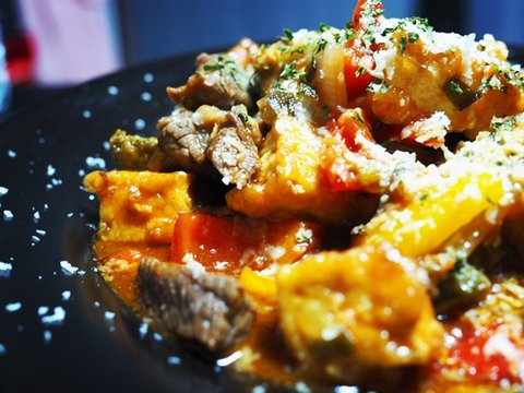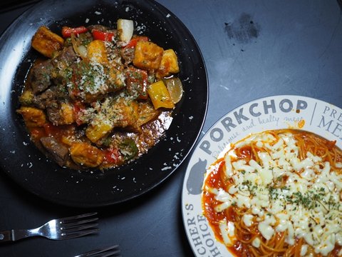 원래는 두부강정이나 두부탕수를 할라고 했는데, 소스가 스테이크 소스밖에 없고 마침 소고기도 있길래 찹스테이크로 메뉴를 급변경하였습니다. 두부를 깍뚝썰어서 6면을 부치는게 생각보다 어렵고 오래 걸리더군요. 양이 적을거 같아 치즈토마토스파게티와 함께...