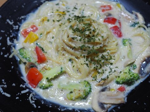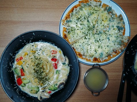 오일파스타만 먹으면 느끼하니까 가끔 크림도 먹어줘야지요ㅋㅋㅋ 파스타만으로는 부족하니 오X기 졸라고르곤피자와 함께!!