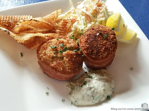 오늘의 메인 요리. 뉴잉글랜드 스타일의 대구 케이크입니다. 베이컨으로 둘레를 한 번 감아준 것이 특이하네요.