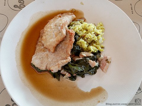 카페테리아식 학생식당 The Egg에서 먹었던 포크 커틀렛과 볶음밥, 콜라드 그린(남부식 푸른잎채소 볶음)