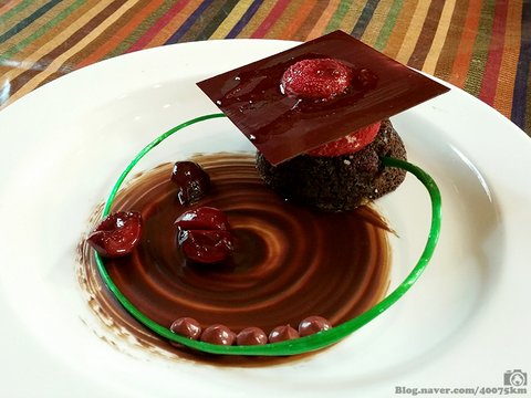 체리 절임과 베리 무스를 곁들인 초콜렛 케이크. 그런데 제일 마음에 들었던 건 초록색으로 뽑아낸 설탕이었습니다.