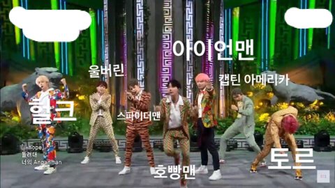 Idol 가사중에 제이홉 파트에서 Superhero라는 가사가 있는데 그때 춤이 멤버 각각이 슈퍼히어로들 마스코트 동작하는거임..