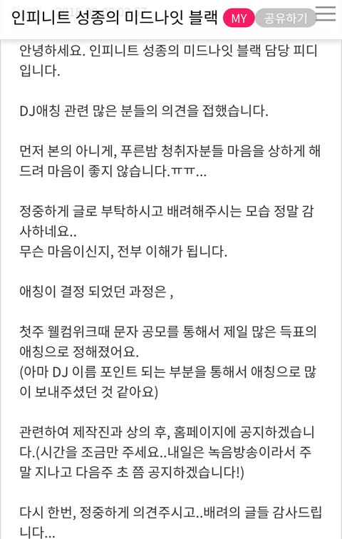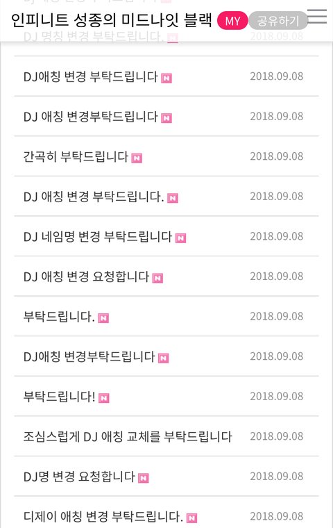 그리고 참고로 새벽에 도배된 저 청취자 게시판 제작진과 디제이 본인이 직접 읽는 곳임.. 아직도 애칭 변경하라는 글 올라오고 있음.