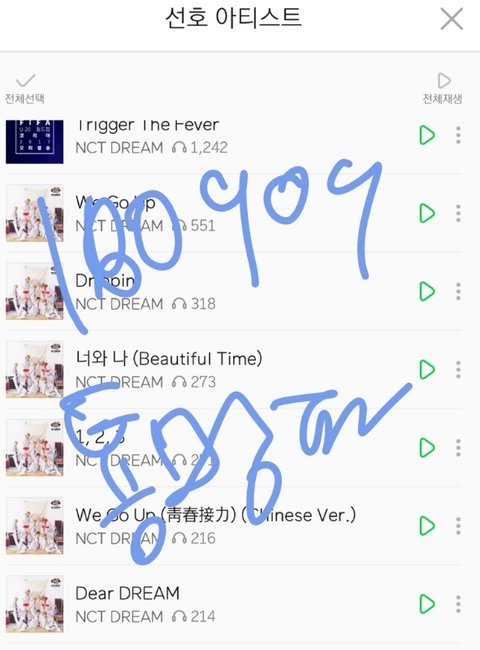 위의 예시를 따라서 쭉 스밍한 nct dream 곡들의 누적횟수를 인증해줘~