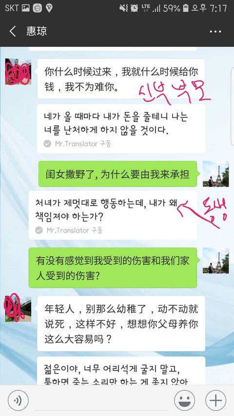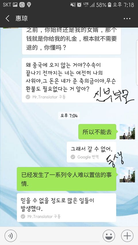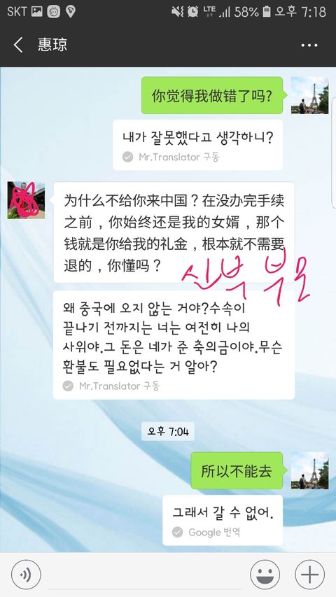 6월9일에 한국으로 왔습니다. 두 사람은 결혼준비를 하던 도중 갑자기 신부되는 사람이 서울에 친구를 만나러 갑자기 간다고 하였습니다.제 동생은 처음에 의심을 했지만 신부가 확고하게 이야기를 해서 동생은 타국생활이 힘들 거 같은 신부를 위해 다녀오라고 했고다녀온 후 6월 말경 신부가 갑작스럽게 임신통보를 하였습니다.제 동생과 저희 가족은 당연히 제 동생의 아이인줄 알고 설렜습니다.근데 갑자기 신부가 아이를 지우고 싶다고 이야기를 했습니다. 이유는 결혼식을 한 후 아이를 갖고 싶다고 했고 동생은 신부를 믿게 되었습니다.아이는 지우게 되었고 그 후 결혼식을 2달 남겨 놓고 저희 어머님은 충격적인 이야기를 듣게 되었습니다. 그 이유는 바로 신부가 지운 아이가 제 동생의 아이가 아니였습니다.그것을 신부 입으로 직접 어머님께 이야기를 하게 되었습니다.그 후 부모님께서는 동생과 신부에게 이혼을 권유를 하였고저희 집은 발칵 뒤집어지며 서울에 있는 저도 깜짝 놀라 집으로 내려가게 되었고 제가 신부랑 얘기를 하게 되었고 처음에는 '동생과 결혼생활 이혼 등 이야기를 했다며 우는 연기를 하며 더 이상 이야기 못하겠다라는 이야기와 함께 더이상 아무말도 안하게 되었습니다.'저는 동생에게 다시 한 번 정확하게 설명 해 달라 이야기를 하였고동생은 그 후로 울며 모든 것을 저에게 이야기하기 시작했습니다.사건에 발단은 6월 2일부터 9일까지는 바람핀 남자와 중국에서 즐겁게 여행 중 임신한 아이였고 신부는 동생에게 늦게 간다는 이유를 만들기 위해 바람 핀 남자가 표를 하나더 구매를 해주었고중간 중간 제 동생은 열심히 일을하며 회사를 다니는 도중 이 신부는 그 남자와 태교여행으로 부산으로 놀러간 사실도 들어났습니다.