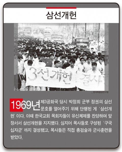 박정희 정권이 삼선을 할 수 있도록 삼선개헌도 지지했다. 이 지지자들이 규합해 만든 단체가 한국기독교총연합회(한기총)다. 한기총은 전두환 정권인 5공화국 종교대책반이 만들어낸 최대 작품이라는 설도 유력하다. 당시 민주화 투쟁의 전면에 나섰던 오충일(전 국정원과거사진실위원회 위원장) 목사는 한기총 결성에 안기부 종교담담 직원이 개입했다고 밝힌 바 있다.