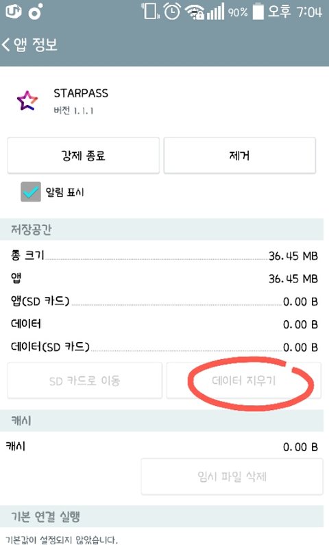 휴대폰 설정에 앱정보-스타패스-데이터지우기-