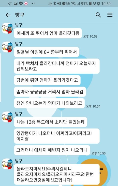 한번은 주말 새벽부터 뛰어다녀서 참다가 한번 올라갔더니.