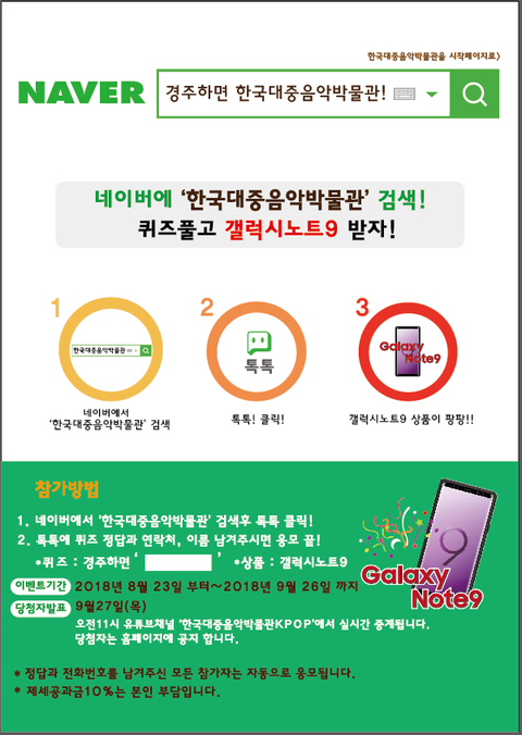 안녕하세요. 경주에 있는 한국대중음악박물관입니다.방탄소년단 싸인의상과 함께 전시중입니다.^^--->왼쪽은 셔츠 뷔, --->오른쪽은 반팔티 지민, 실제 평소에 착용했던 싸인의상 입니다.네이버에서 " 한국대중음악박물관" 검색 하셔서 방문해 주시면 감사합니다.-------------------------------------------------------갤럭시 노트9 박물관 이벤트내용 이미지첨부 부탁드리구갑니다... 꾸벅(_ _)많은분들이 참여하시면 좋을거같아요ㅎㅎ