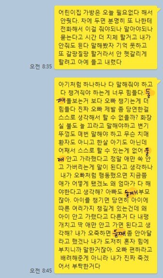 어린이집 가방 이야기는 아침에 출근 후 신발 가지러 가는 남편한테 차 인계하면서 제가 가지고 내리니 남편이 그건 왜 가지고 내리냐고 물어서 긴말할 시간도 없고, 어차피 말해봤자 또 까먹고 헷갈릴 사람이라 그냥 신경쓰지 말라고 톡 쏘아버렸더니 남편도 버럭거려서 설명한거에요.