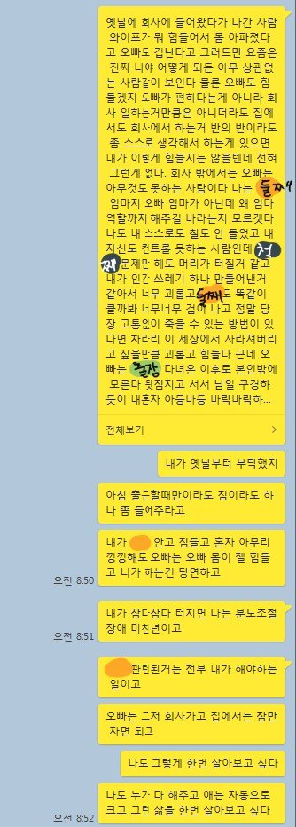 아이도 만들때 기분만 살짝 내고나니 크는거 누가 다 해줘서 자동으로 크고...(그 '누가'는 저겠죠?) 그런 삶을 사는 이 나라 일부 남자들은 어떤 기분일까요? 본인의 삶이 사랑하는 누군가의 희생으로 그렇게 편하다는 사실조차 모르고 살고들 있겠죠? 그들에겐 당연한 일상이니까요.