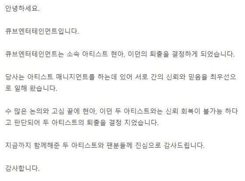 니네말대로 현아가 큐브 공주인데도 퇴출했다는건 소속사도 앵간히 독품은거임ㅋㅋㅋ 남은 애들한테 소속사 말 안듣고 충동적으로 행동하면 이렇게된다 라고 본보기로 보여준것도 있을거고, 현아 컨셉 솔직히 이제 바닥났고 앨범 내도 별로 소비량이 없으니 큐브입장에서는 안쳐낼 이유가 없지