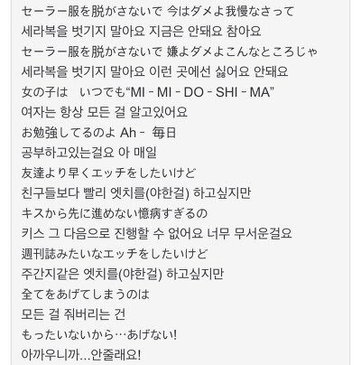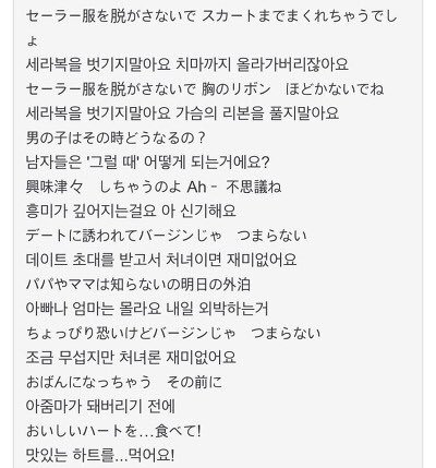 대체 오타쿠 개저씨들이 환장할만한 원조교제에 사제간의 사랑에 미성년자를 성적대상화한 노래 가사들을 13~19살짜리 미성년자 멤버들한테 부르라고 시키는 야키모토 야스시(((심지어 극 우익))))의 어느 부분이 맘에 들었던거임?일본 애니랑 뭣같은 세계관에 미쳐서 방탄이 어떻게 욕쳐먹던 뒷전인거 실화냐 ㅋㅋㅋㅋㅋ일본팬들도 반대하던데 대체 누구 좋으라고 콜라보 하는거임? 아 진짜 빡쳐서 돌아버릴것같다 ㅅㅂ
