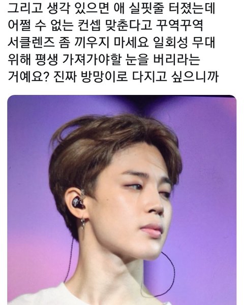 눈 실핏줄 터졌는데 렌즈끼고 무대했대.... 어쩐지 오늘 머리 내렸더라니... 최근에 느끼지만 피땀이후로 애들 서클렌즈 엄청 끼지않나 화보든 무대든 콘서트든 다 끼게하고ㅋ 눈 잘못되면 평생 책임져줄건가 빅히트 일처리 진짜 마음에 안듦