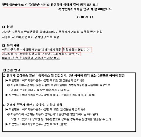 렌트차량으로 펫택시 영업을 하는 행위는 이유불문 불법입니다.