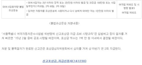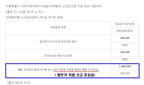 서울시에선 렌트차량으로 불법 펫택시 영업 업체 신고시 20만원의 포상금을 지급하며,