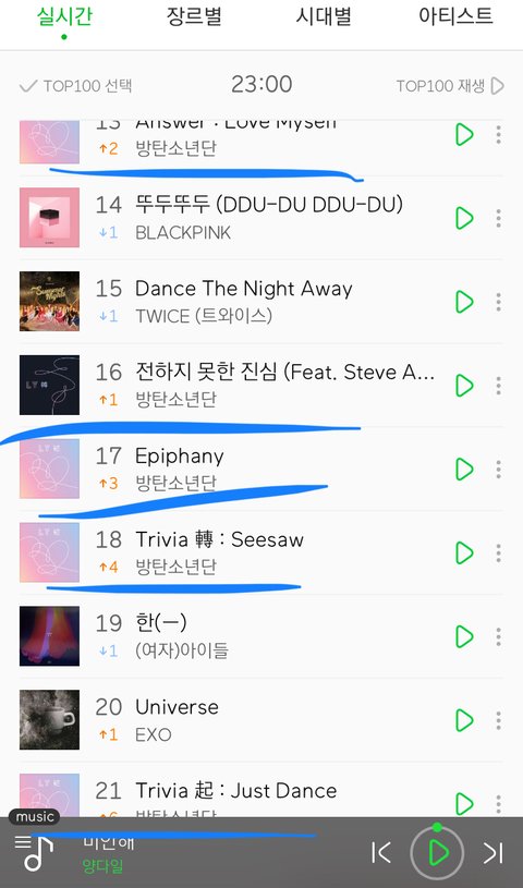 새벽 차트 이제 좀 괜찮을라나 하고 봤는데 똑같음 새벽에 순위올라가는건ㅋㅋㅋㅋ뭐가 달라진겨 ㅋㅋㅋㅋㅋㅋㅋㅋㅋㅋㅋㅋㅋ 심지어 맨 마지막껀 6업임ㅋㅋㅋㅋㅋ