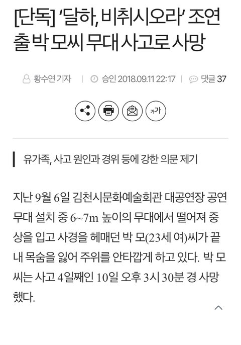 위 기사를 참고해주세요! 피해자 박씨는 제 친구입니다. 친구는 같이 일한 적 있었던 스텝의 권유로 조연출로 참여했었고, 작화 작업을 하던 중 무대 리프트에서 추락하는 사고를 당했습니다. 이 사고로 친구는 안면 골절, 두개골 골절, 팔 골절, 그리고 간과 폐손상이라는 부상을 입었고 과다출혈로 손 한번 못 써보고 5일간 사경을 헤매다가 지난 월요일 세상을 떠나게 되었습니다.